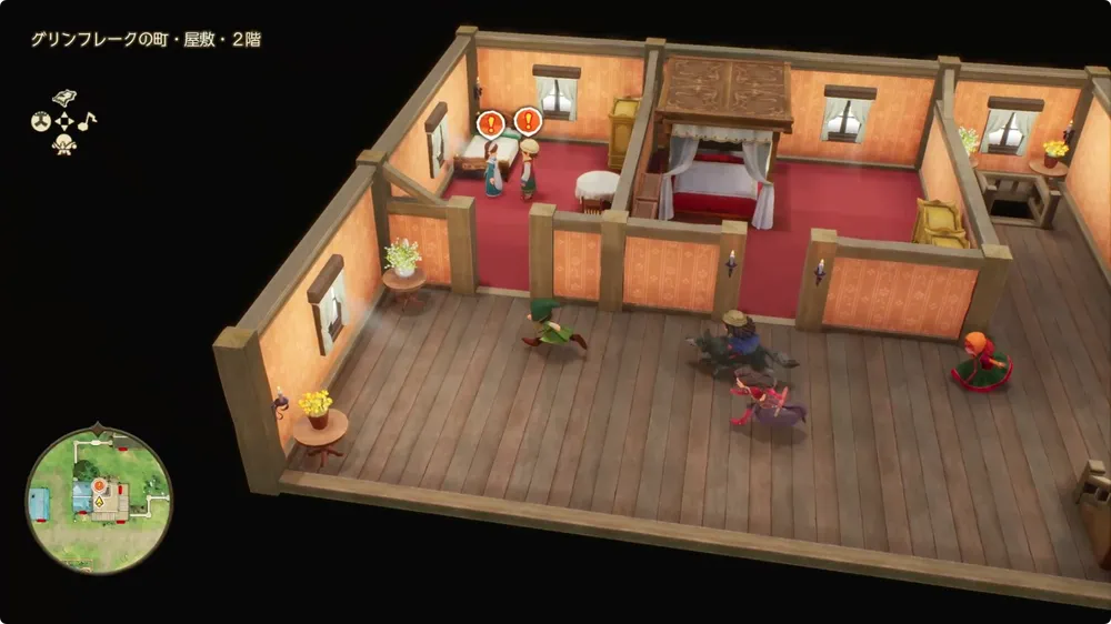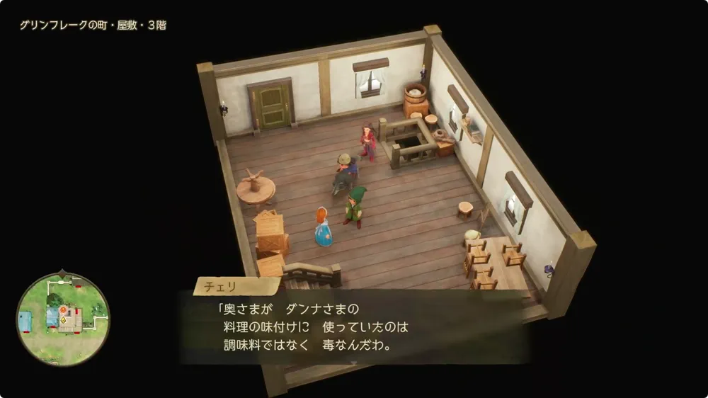 屋敷の3階にチェリがいるので、屋敷の外で手に入れた「むらさきの小ビン」を渡そう。渡した後、階段を下りていくと2階と1階でイベント発生する。