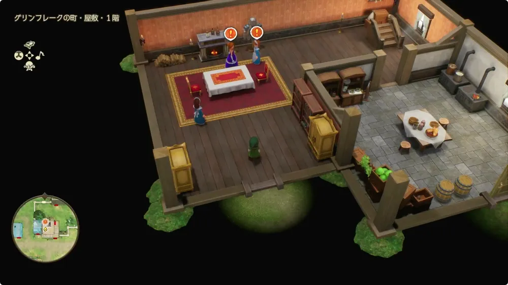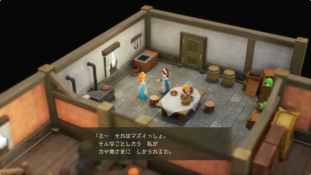 屋敷に入ろうとするとイベントが発生する。イベント発生後は屋敷の厨房へ向かい会話を聞こう。