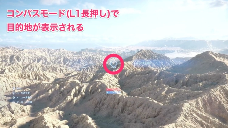 コンパスモード(L1長押し)で目的地を把握できる。向かう方向を大まかに把握するのに活用しよう。