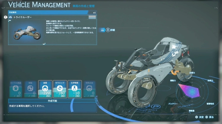 依頼007を受注すると、車両「トライクルーザー」を作成できるようになる。
