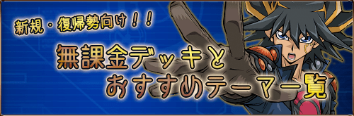 遊戯王デュエルリンクスの無課金・初心者おすすめデッキを一覧にして掲載しています。無課金おすすめテーマの他に、微課金で組める強いデッキやおすすめパックも紹介しているのでデッキを組む際の参考にしてください。
