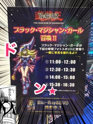 クリアファイルを手に入れて満足していたら、気になるお知らせを発見!なんと所定の時間になると、ブースにBMGことブラックマジシャンガールが召喚されるとのことです!