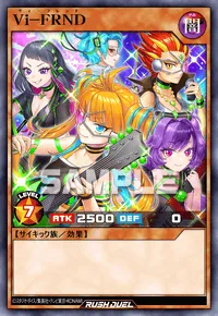 《Vi-FRND》はデッキトップのカードを墓地へ送って自己強化でき、墓地肥やし枚数を1~5枚に調整できるのでデッキ切れを恐れずに発動できる。更に特定のモンスター5種類が墓地に揃っていれば相手カード1枚を破壊でき、カードの種類を問わないので高打点のマキシマム・フュージョンモンスターが相手でも突破できる。