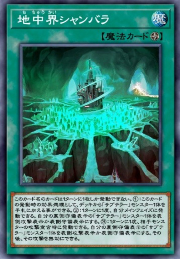 | このカード名のカードは1ターンに1枚しか発動できない。①:このカードの発動時の効果処理として、デッキから「サブテラー」モンスター1体を手札に加える事ができる。②:1ターンに1度、自分メインフェイズに発動できる。自分の裏側守備表示の「サブテラー」モンスター1体を選んで表側攻撃表示または表側守備表示にする。③:1ターンに1度、相手モンスターの攻撃宣言時に発動できる。自分の裏側守備表示の「サブテラー」モンスター1体を選んで表側攻撃表示または表側守備表示にする。その後、その攻撃を無効にできる。 | |
