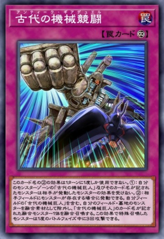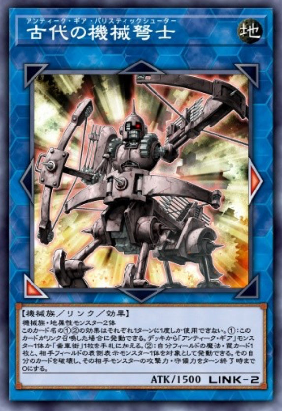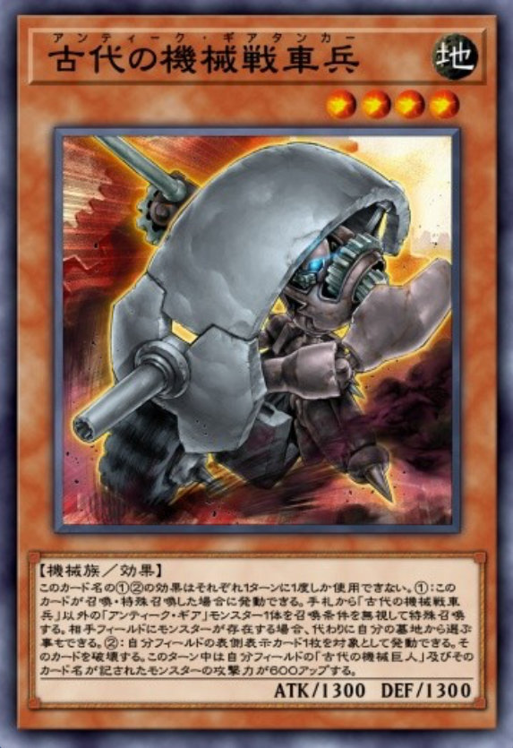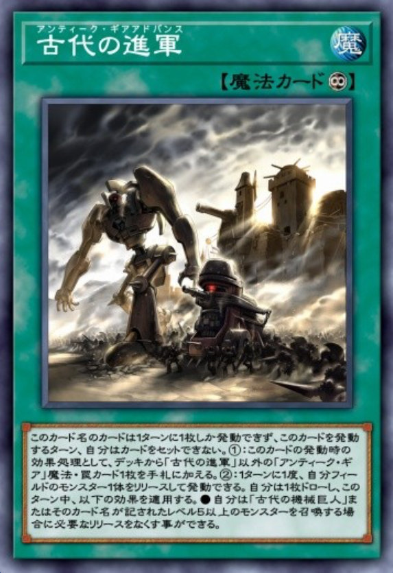 | 《古代の機械暗黒巨人》はデッキから「アンティーク・ギア」カードや《歯車街》を計2枚サーチすることでその後の展開へ繋げやすく、《古代の進軍》は魔法・罠のサーチやアドバンス召喚時のリリースを軽減できる。《歯車街》を破壊しやすい《古代の機械弩士》も実装されており、久方振りの環境上位への復帰が期待される。 |