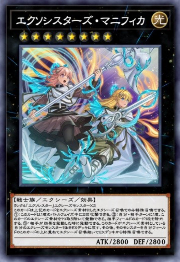 | 下級モンスターは相手によって墓地のカードが移動すると自身に「エクソシスター」Xモンスターを重ねて出せる共通効果を持ち、ランク4は墓地から蘇生されたモンスターに対する耐性や墓地利用を妨害する効果などを持つ。ランク8の《エクソシスターズ・マニフィカ》は打点と連続攻撃を併せ持ち、フィニッシャーとして扱いやすいぞ。 |