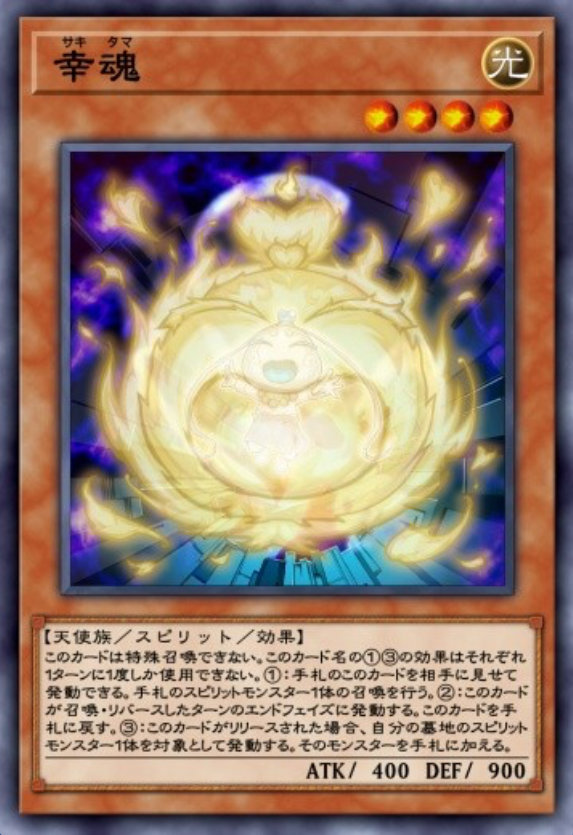 | このカードは特殊召喚できない。このカード名の①③の効果はそれぞれ1ターンに1度しか使用できない。①:手札のこのカードを相手に見せて発動できる。手札のスピリットモンスター1体の召喚を行う。②:このカードが召喚・リバースしたターンのエンドフェイズに発動する。このカードを手札に戻す。③:このカードがリリースされた場合、自分の墓地のスピリットモンスター1体を対象として発動する。そのモンスターを手札に加える。 |