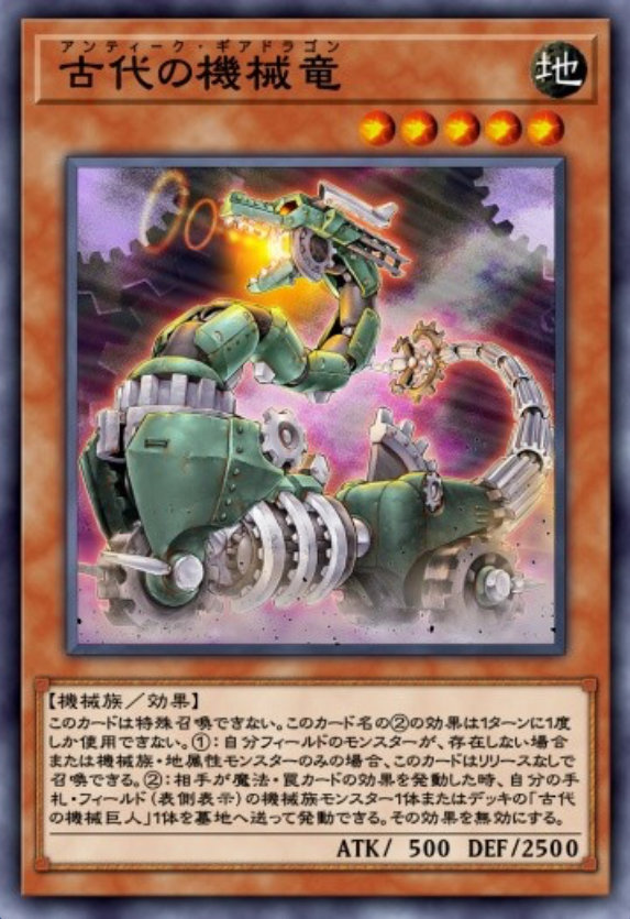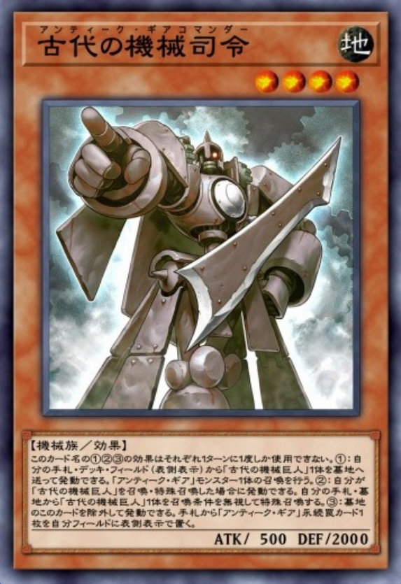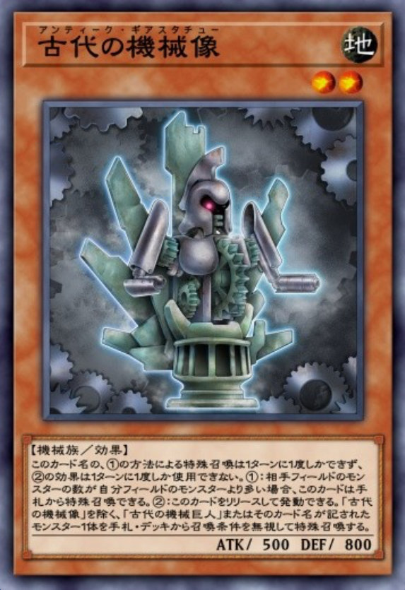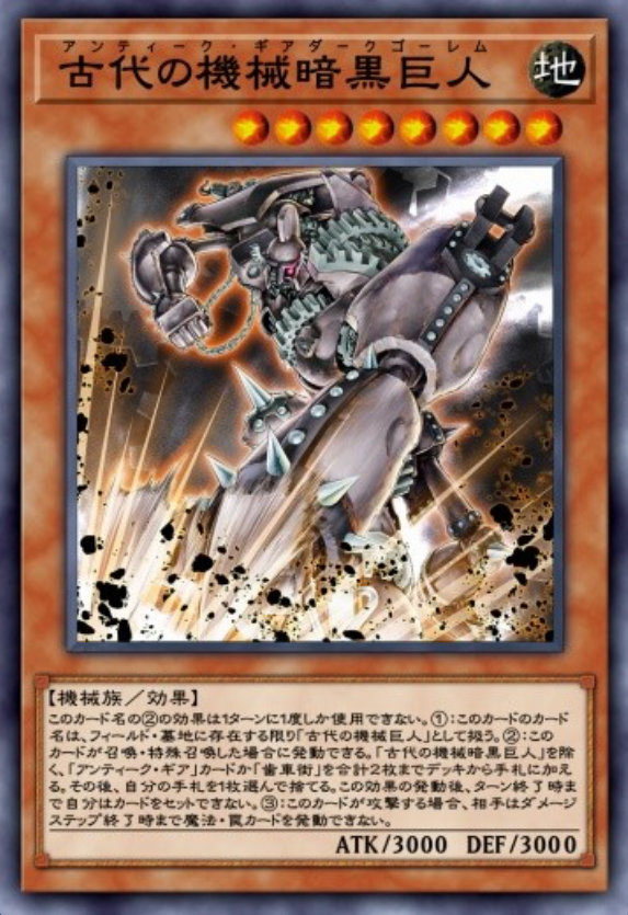 | このカード名の②の効果は1ターンに1度しか使用できない。①:このカードのカード名は、フィールド・墓地に存在する限り「古代の機械巨人」として扱う。②:このカードが召喚・特殊召喚した場合に発動できる。「古代の機械暗黒巨人」を除く、「アンティーク・ギア」カードか「歯車街」を合計2枚までデッキから手札に加える。その後、自分の手札を1枚選んで捨てる。この効果の発動後、ターン終了時まで自分はカードをセットできない。➂:このカードが攻撃する場合、相手はダメージステップ終了時まで魔法・罠カードを発動できない。 |
