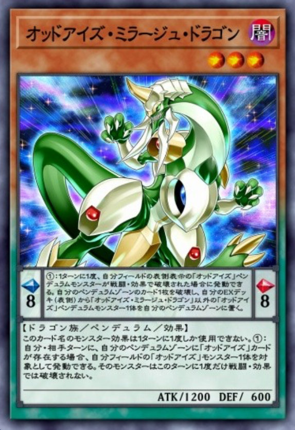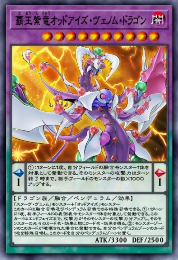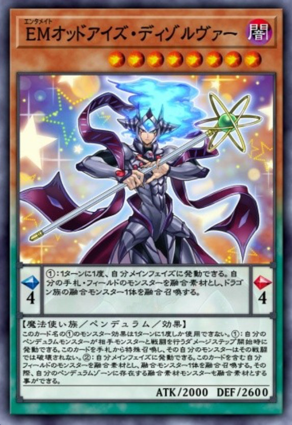 | 《EMオッドアイズ・ディゾルヴァー》は戦闘に乗じた特殊召喚効果に加えてモンスター・P効果のどちらでも融合召喚が行え、《覇王紫竜オッドアイズ・ヴェノム・ドラゴン》は自己強化効果や融合モンスターを強化するP効果などを持つ。新スキルも実装されており、環境上位への復帰が期待される。 |