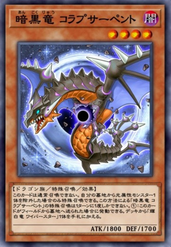 | このカードは通常召喚できない。自分の墓地から光属性モンスター1体を除外した場合のみ特殊召喚できる。この方法による「暗黒竜 コラプサーペント」の特殊召喚は1ターンに1度しかできない。①:このカードがフィールドから墓地へ送られた場合に発動できる。デッキから「輝白竜 ワイバースター」1体を手札に加える。 | |