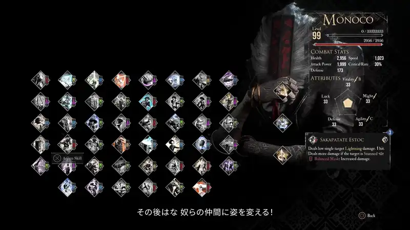 本作は特性強化でどのステータスを伸ばすか、どのスキルやピクトスを装備するかによって戦い方が大きく変わる。