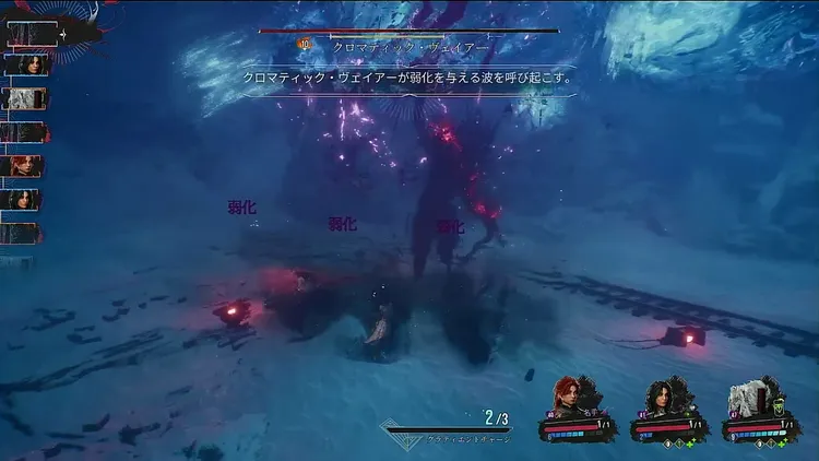 ボスは様々な攻撃で味方に弱化を付与してくる。特に厄介なのは味方全体に弱化を6スタック与える攻撃。ダメージはないが、回避もできないので、確実に最大体力が削られてしまう。