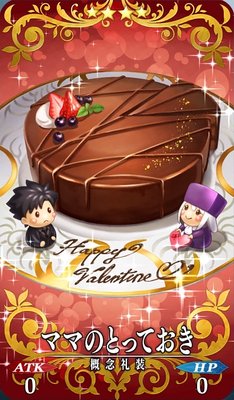 | 解説 | アイリスフィール〔天の衣〕からのバレンタインチョコ。 チョコレートのケーキは好きかしら。 これはね、ザッハトルテというの。 ああ、砂糖菓子のお人形? これはね…… イリヤとキリツグに似せて作ってみたの。 いいえ、カルデアにいるイリヤではなくて─── 込み入った話になってしまうから、また今度ね。 |