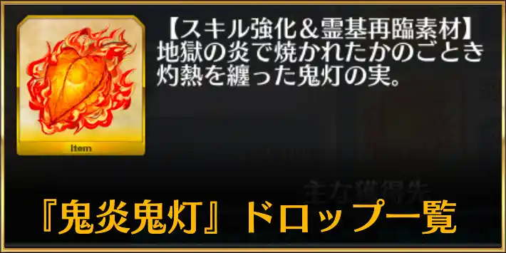 FGOの「鬼炎鬼灯(鬼灯/きえんほおずき/きえんほおづき)」についてまとめた記事です。効率よく入手するために必要な最高効率のフリクエの情報や必要数をはじめ、使用するサーヴァントも掲載しているので参考にしてください。