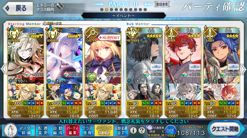 【FGO】編成投稿掲示板 2022年08月22日 16時22分 AppMedia編集部 魔法使いの夜コラボ開催!まほよコラボ最新情報まとめ オーディールコールオーディールコールまとめオルガマリークエスト2攻略/パーティ掲示板アクアマリー戦攻略 新任務限定ミッションサンゴ礁に眠る財宝のゆくえ(高難易度)女神像を求めて(アメリカ東部)常夏即売会場(ハワイ) 奏章2イド 奏章2イドの攻略イドのフリークエストまとめ 春の新米マスター応援キャンペーンキャンペーンまとめフレンド募集掲示板 90 ななしのマスター 2024-03-12 22:31:48 6積オダチェンあり コストマスター礼装 - 前衛 宝具:5 礼装:- 宝具:3 礼装:- 宝具:- 礼装:- スキル1スキル2スキル3スキル1スキル2スキル3スキル1スキル2スキル3 101010101010101010 アペンドアペンドアペンドアペンドアペンドアペンドアペンドアペンドアペンド -10--10---- 控え 宝具:- 礼装:- 宝具:- 礼装:- 宝具:- 礼装:- スキル1スキル2スキル3スキル1スキル2スキル3スキル1スキル2スキル3 101010------ アペンドアペンドアペンドアペンドアペンドアペンドアペンドアペンドアペンド --------- 編成の説明 クリームヒルトレベル100宝具5金フォウmax礼装固定モルガンレベル100宝具3金フォウ500使ってますクリームヒルトアペンド2必須モルガンアペンド2max必須スキルは全部クリームヒルトへ1wクリームヒルト全スキルモルガンs2キャストリアs2s3クリームヒルト宝具2wモルガンs1キャストリアs1オダチェン キャストリア→オベロンオベロンs1モルガン宝具3wオベロンs2s3クリームヒルト宝具1wが最低乱数引くと少し残るので追撃もしくはマスター礼装のs1使う。 凸黒聖杯なし6積み × 書き込み中・・・ この記事の執筆者 FGO攻略班 記事をシェアする シェア つぶやく はてブ LINE URLコピー コピーしました 人気記事新着記事 オルガマリークエスト2の攻略 アクアマリー戦の攻略 魔法使いの夜コラボ(まほよコラボ)の攻略と最新情報 オーディールコールの攻略 オルガマリークエスト2のクリアパーティ報告掲示板 「サンゴ礁に眠る財宝のゆくえ(ハワイ)」の攻略 「常夏即売会場(ハワイ)」のドロップと敵編成 オルガマリークエスト2の9waveの攻略 「女神像を求めて(アメリカ東部)」のドロップと敵編成 オルガマリークエスト1の攻略と報酬 人気記事をもっとみる オルガマリークエスト2のクリアパーティ報告掲示板 魔法使いの夜コラボ(まほよコラボ)の攻略と最新情報|開催はいつ? アクアマリー戦の攻略|オルガマリークエスト10wave オルガマリークエスト2の9waveの攻略 オルガマリークエスト2の8waveの攻略 新着記事をもっとみる