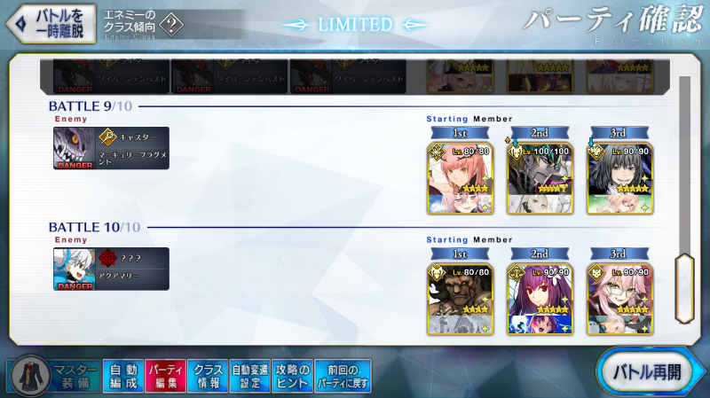 4.適当な全体ランサー三人。NP溜まれば宝具、駄目ならとりあえず殴る。スキルレベル上がってなくて即宝具できずに撃ち漏らしました。