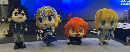 リアルイベント定番のコスプレイヤー・着ぐるみグリーティング。着ぐるみはまんわかの女主人公、アルトリア、ジャンヌ、謎丸の男主人公の4体。