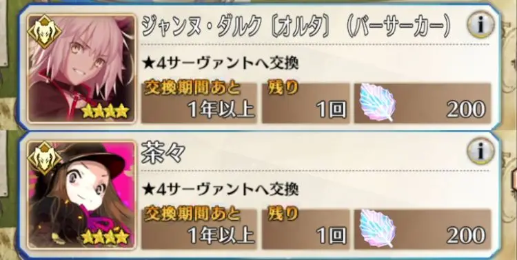 冬木をクリアしたタイミングで対象ラインナップ内から好きな星5サーヴァントを1騎交換できる。