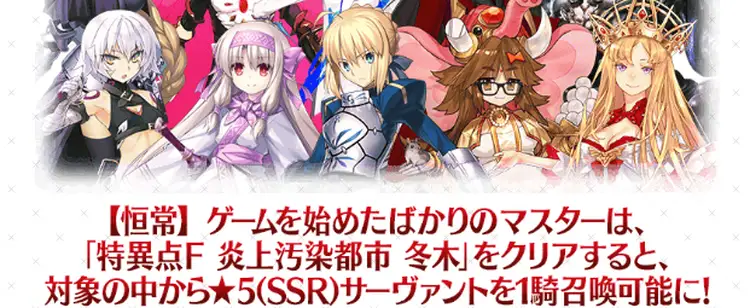 有償石(課金石)限定ではあるが、ラインナップ内から星5サーヴァントを1騎確定で入手できるスタートダッシュ星5確定召喚がチュートリアルクリア後の30日間回すことができる。