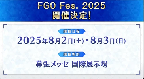 今年もリアルイベントが開催決定。FGOフェス2025は8月2日・8月3日の2日間、過去最大のホール数で開催されるとのこと。