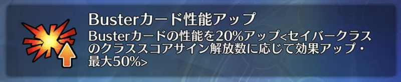 自身のコマンドカードを含むバスターチェイン成立時、自身のHPが多いほどバスターカード威力アップ(1T/20〜50%) | |