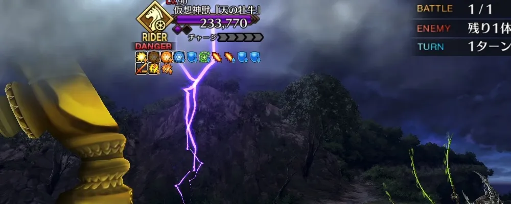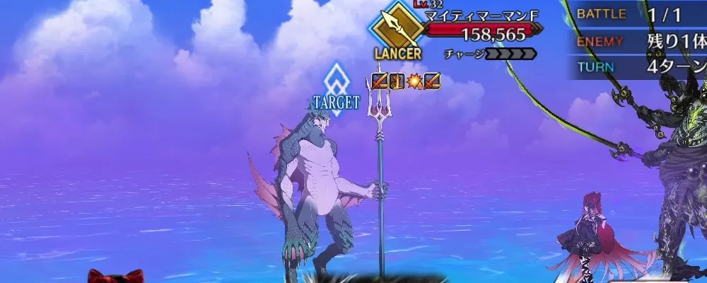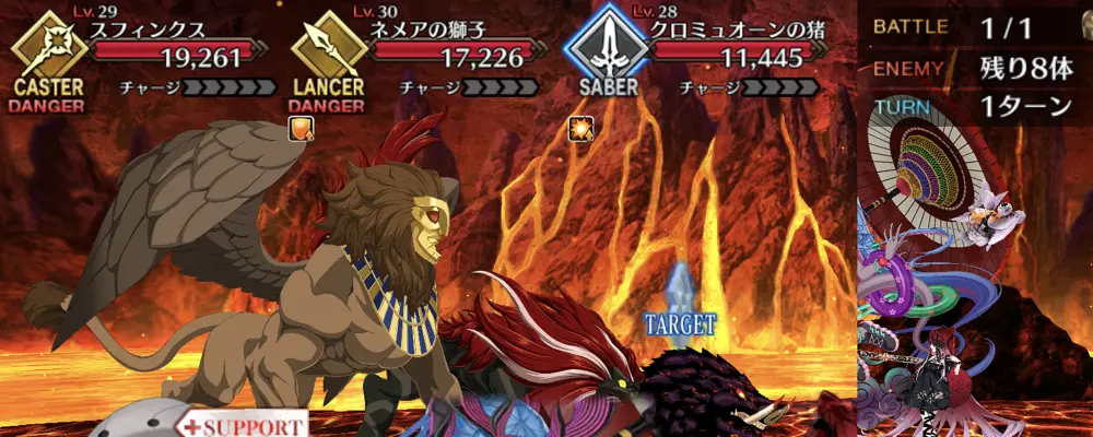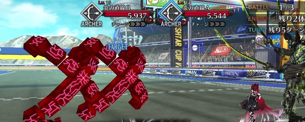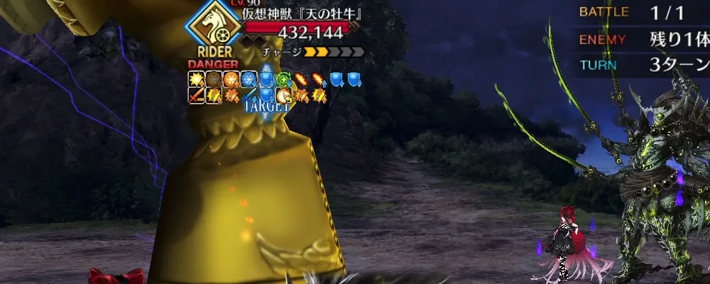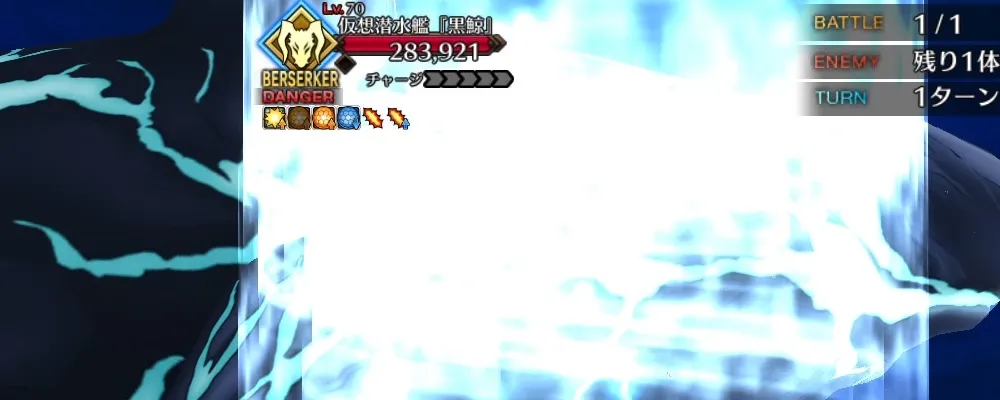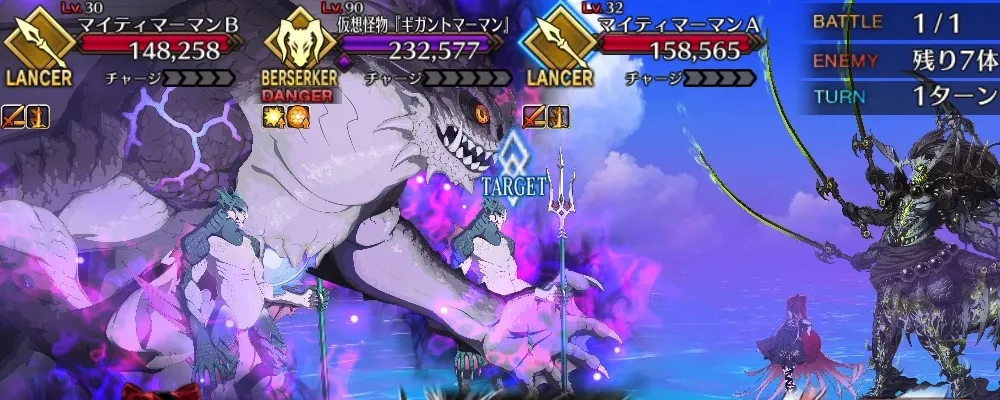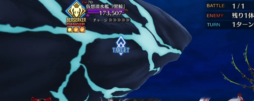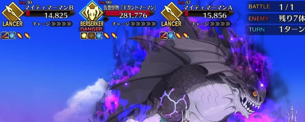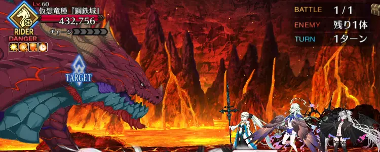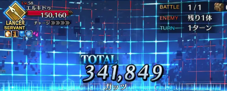 開幕からガッツが7回付与されており、全てのガッツを発動させるとクリアになる。ガッツを発動させるとチャージMAXと宝具バフを付与してくるため、耐性アップや無敵等で対策しよう。