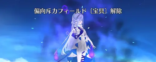 | 【斥力転換〔宝具〕】※一定回数宝具攻撃で発動 自身のクリティカル攻撃に対する耐性を解除 &宝具攻撃に対する耐性アップ(90%) |