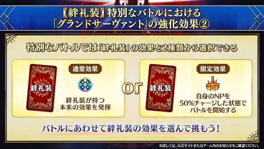 グランドサーヴァントは全てのバトルにおけるHP、ATK+1000、特別なバトルにおいては後で紹介するグランドスコアによるバフに加えて、絆礼装+(絆やQPなど)増加系礼装を追加で装備できるなどの恩恵が発生する。