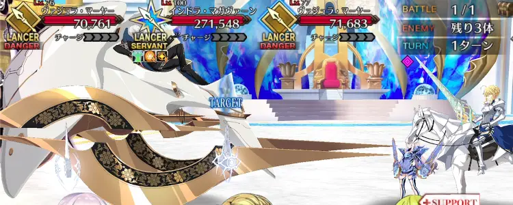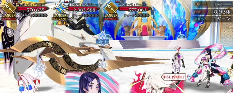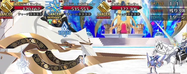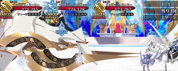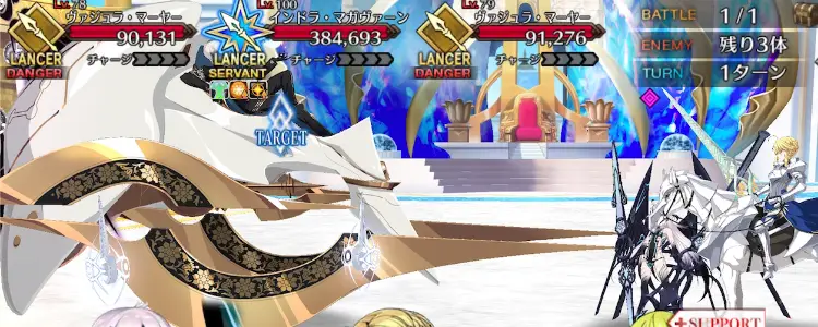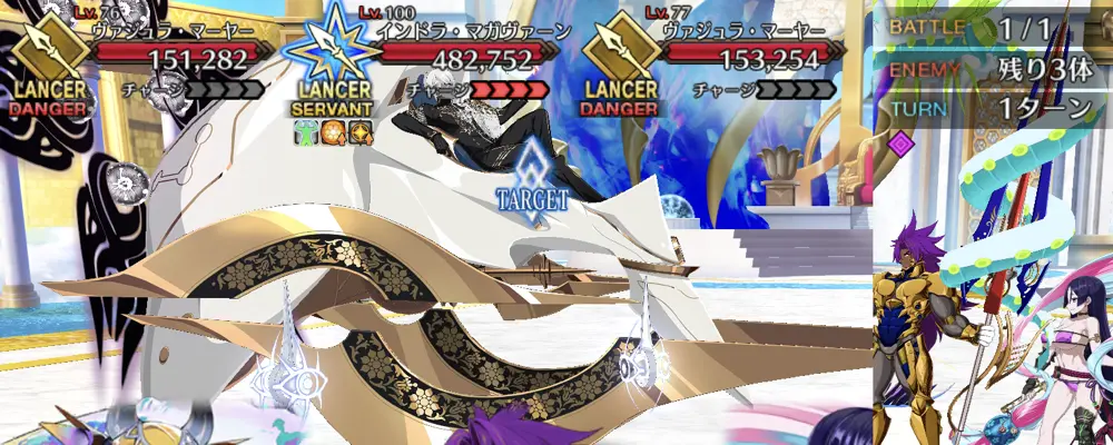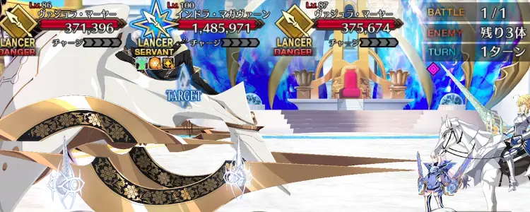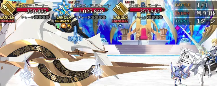 今までの戴冠戦は冠位英霊1騎と諸々のクエストを戦う仕様であったが、今回のインドラに関しては取り巻きのヴァジュラとセットで戦う敵複数配置の戦闘となっている。