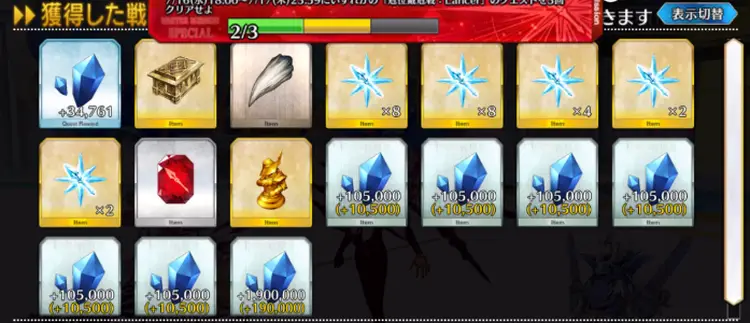 冠位戴冠戦ランサー関連のミッションや報酬だけで、聖杯や伝承結晶、各種トーチ、★5フォウなどが獲得できるので基本的には参加した方が良いコンテンツとなっている。