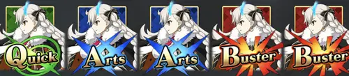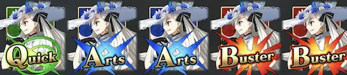 | 宝具 | 【 敵全体のクイック耐性ダウン(1T/20%) &アーツ耐性ダウン(1T/20%) &バスター耐性ダウン(1T/20%) &強力な人・星特攻攻撃(OC:150〜200) +味方全体の攻撃力アップ(3T/LV:10〜30%) &NPチャージ(10%) &人・星属性または今を生きる人類のNPチャージ(10%) |