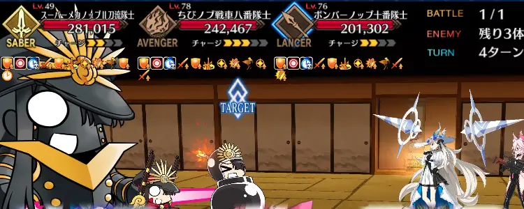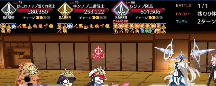 一緒に場に出ている他取り巻きのチャージ攻撃タイミングと重なって、即死コンボを喰らってしまう可能性があるので、はにわノッブを見つけたら早めの撃破を心がけておこう。