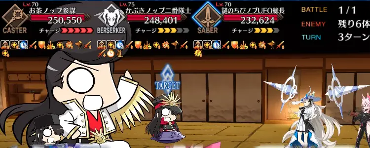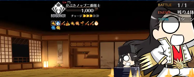 後半の方で出てくるお茶ノッブが場にいる間、被強化成功率ダウン(最大3回)が付与されるため、付与したいバフや防御系効果が失敗してしまう可能性がある。