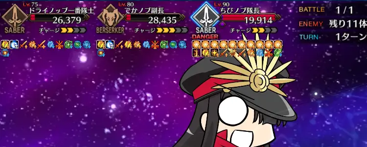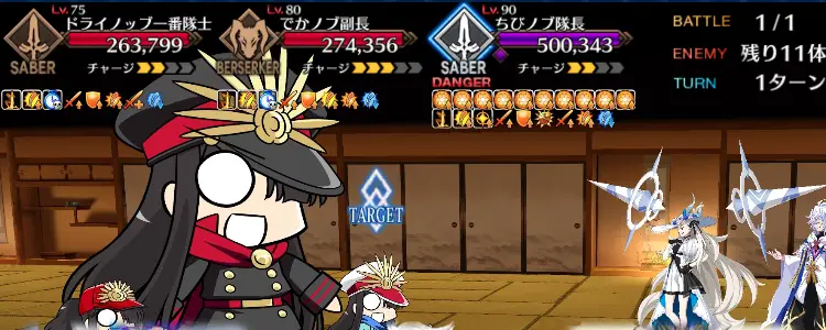 ブレイクゲージ持ちのちびノブ隊長は特殊耐性を大量に所持。まわりのエネミーを倒すことでひとつずつ耐性が外れるので、全体宝具連射で対応していきたい。