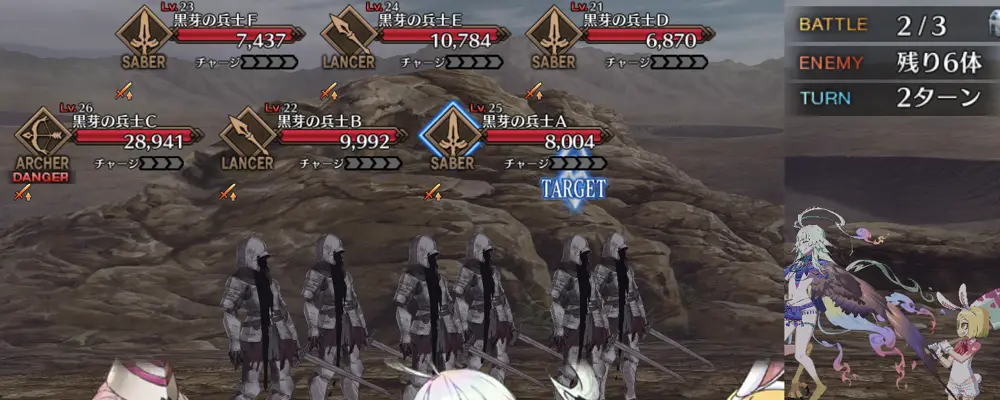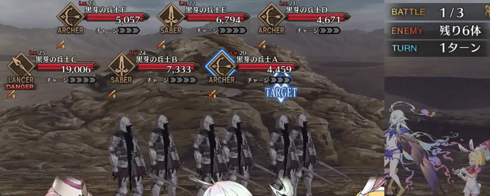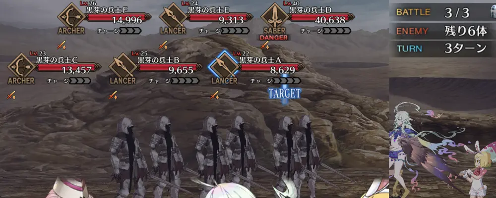 編成制限は特になし。敵全体に無敵1回1T。無敵貫通を用意or強化解除or全体宝具連射で対処したい。