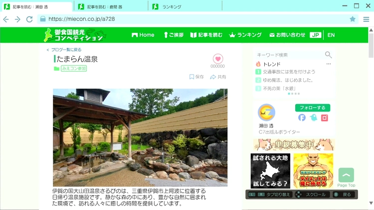 温泉地を巡り、「温泉温泉」のテーマで記事を量産することで「いいね」の数を大量に稼ぐことができる。(いいね800超えを確認)