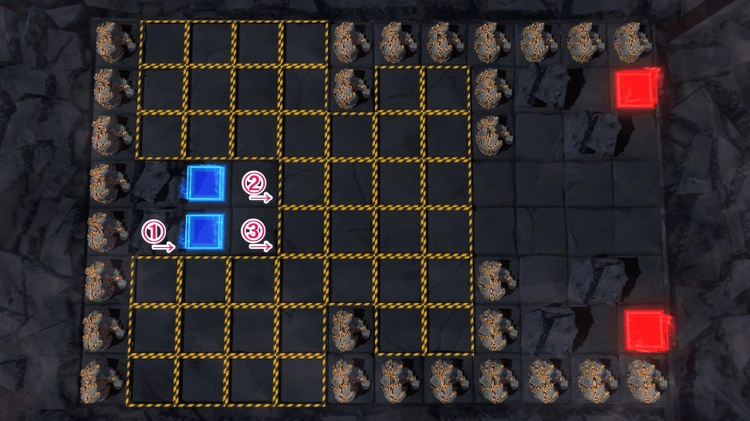 吹き飛ばし×2(b/c/e/f)と引き寄せ×1(a/d)で攻略。