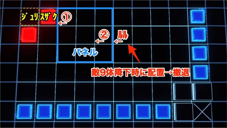 ┗左は出し入れするキャラでブロックして進行を遅らせると特式カレン配置が間に合う - 初動の雑魚敵をKMFスキルで撃破したら特式にフレームコートを装着
