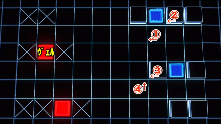 残った雑魚で③と④をチャージし終えたら②を撤退、③・④を上に方向転換して敵コーネリアをスキルで撃破。