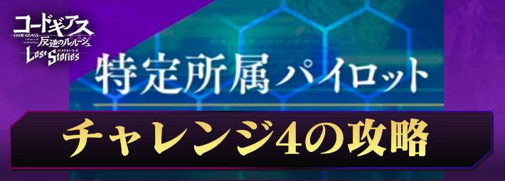 ロススト(コードギアスロストストーリーズ)のチャレンジ4特定所属パイロットの攻略とクリア編成例の記事です。チャレンジ4の仕様や各階層の攻略のポイント、編成例と立ち回りについてはこちらをご覧ください。