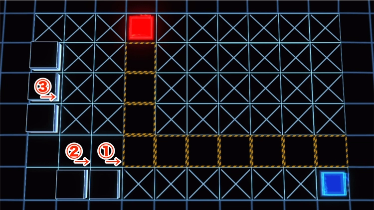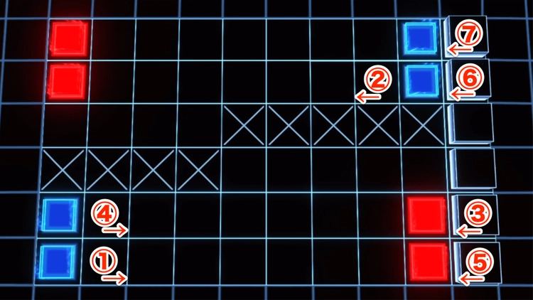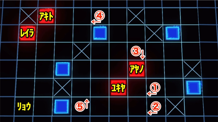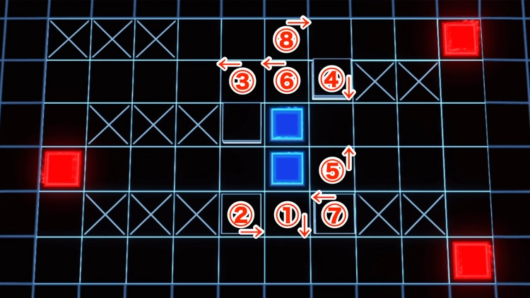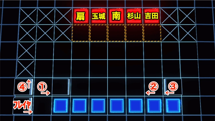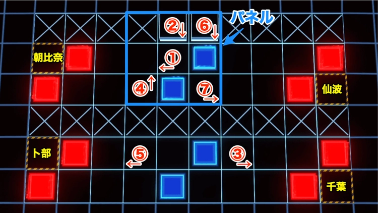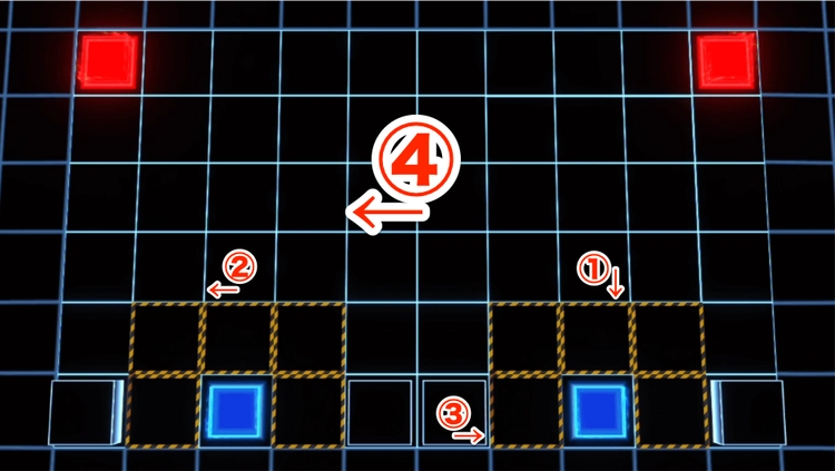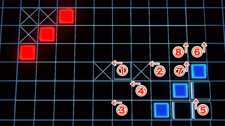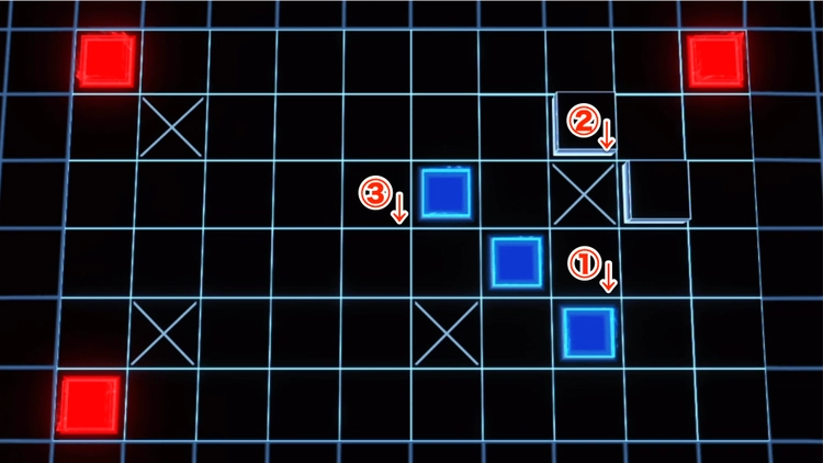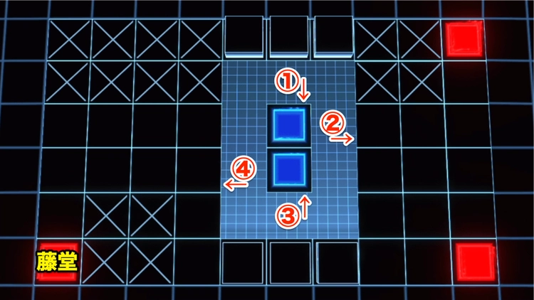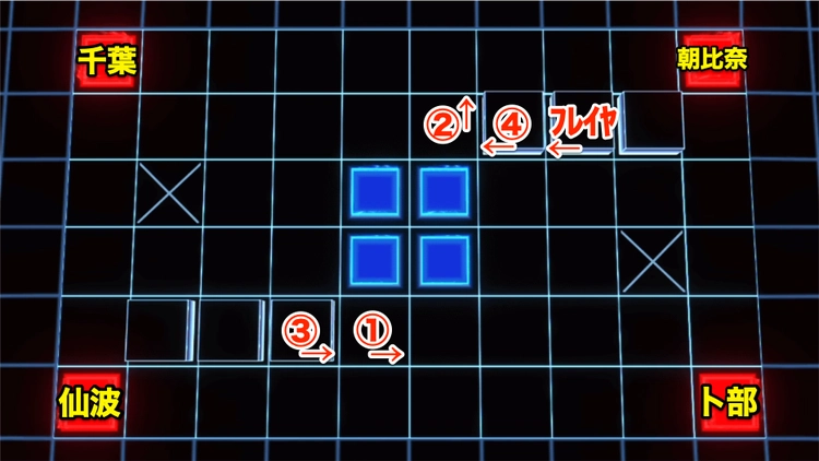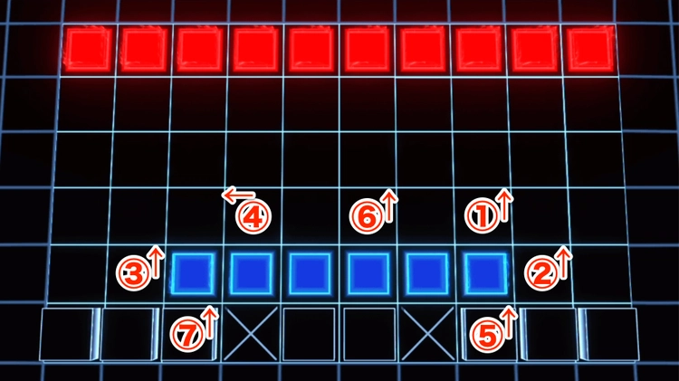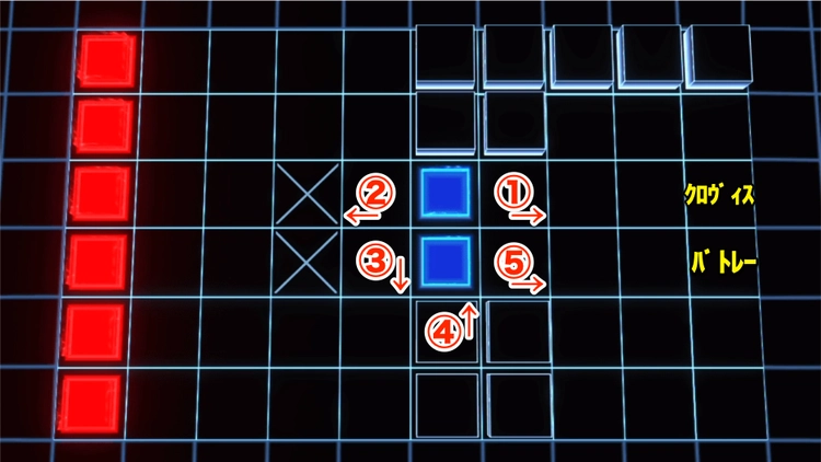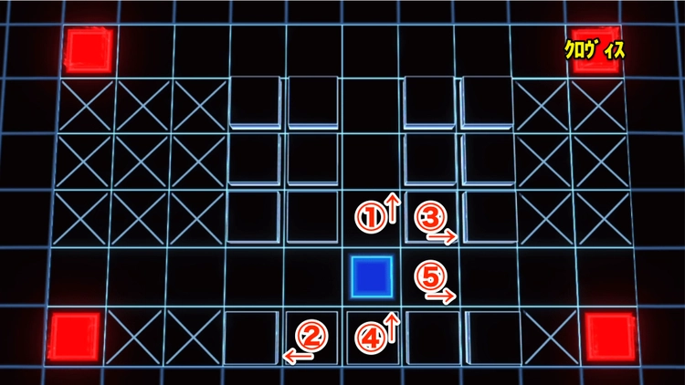 ①〜⑤を順に配置、順当にスキルを撃っていけば勝てる。撃ち漏らしが出そうになった場合のみ方向転換も使用。