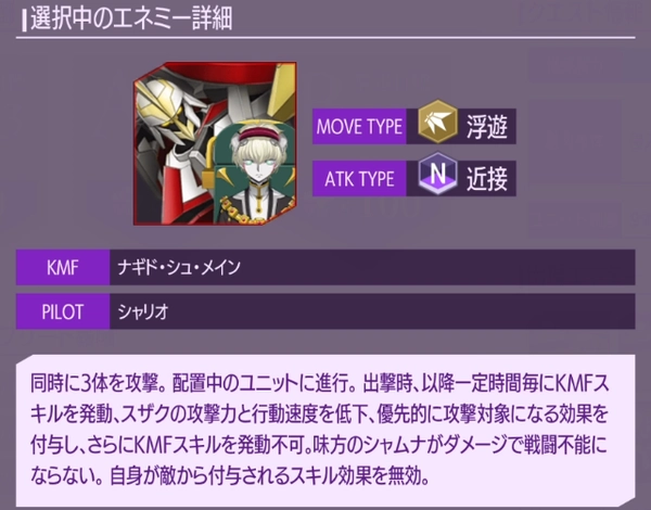 シャムナは登場時にKMFスキルゲージを0にしてくるので、シャリオを撃破するアタッカーは合体を用いたデバフ無効キャラやコスト/HPのスキル連打が可能なキャラが望ましい。