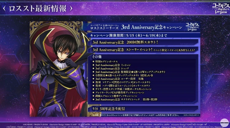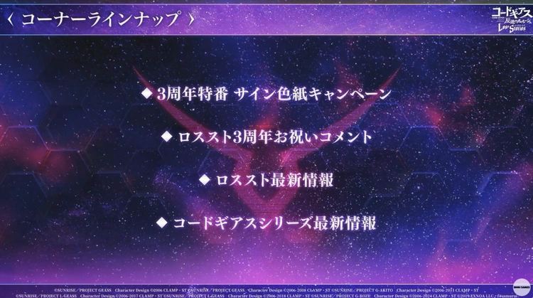 ロスストの2025年5月14日(水)に放送される「3周年記念特番」で発表された最新情報のまとめ記事です。放送中に紹介されたイベントやキャラ、KMFなどについてまとめていますので、放送を見逃してしまった方はぜひご覧ください!