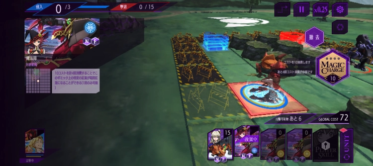 好きなKMFの上にワープ魔法陣、 動きたい場所に魔法陣を置くと魔法陣の上のKMFの必殺スキル等を発動する画面にワープが出ますので、動きたい場所にKMFを動かすとワープ出来ます。因みに遠隔しか無ければ無理ですが、接近持ちの機体であれば最初遠隔でも、場所によっては守護出来る様な接近機にもなります。 なので、最初遠隔なKMFで武器解放してなくても通さない護りのKMFになる事も出来ます。