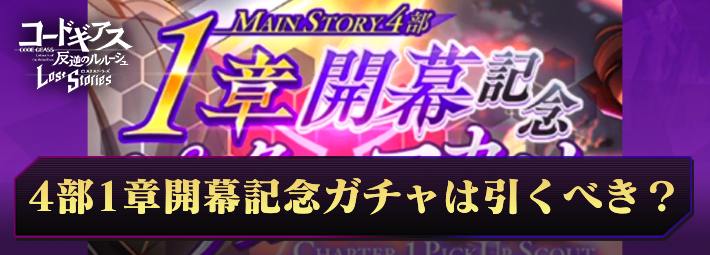ロススト(コードギアスロストストーリーズ)の4部1章開幕記念ピックアップスカウトは引くべきかを解説しています。新キャラの性能や解放KMFなども記載していますので、ガチャを引くか悩んでいる方はお役立てください。
