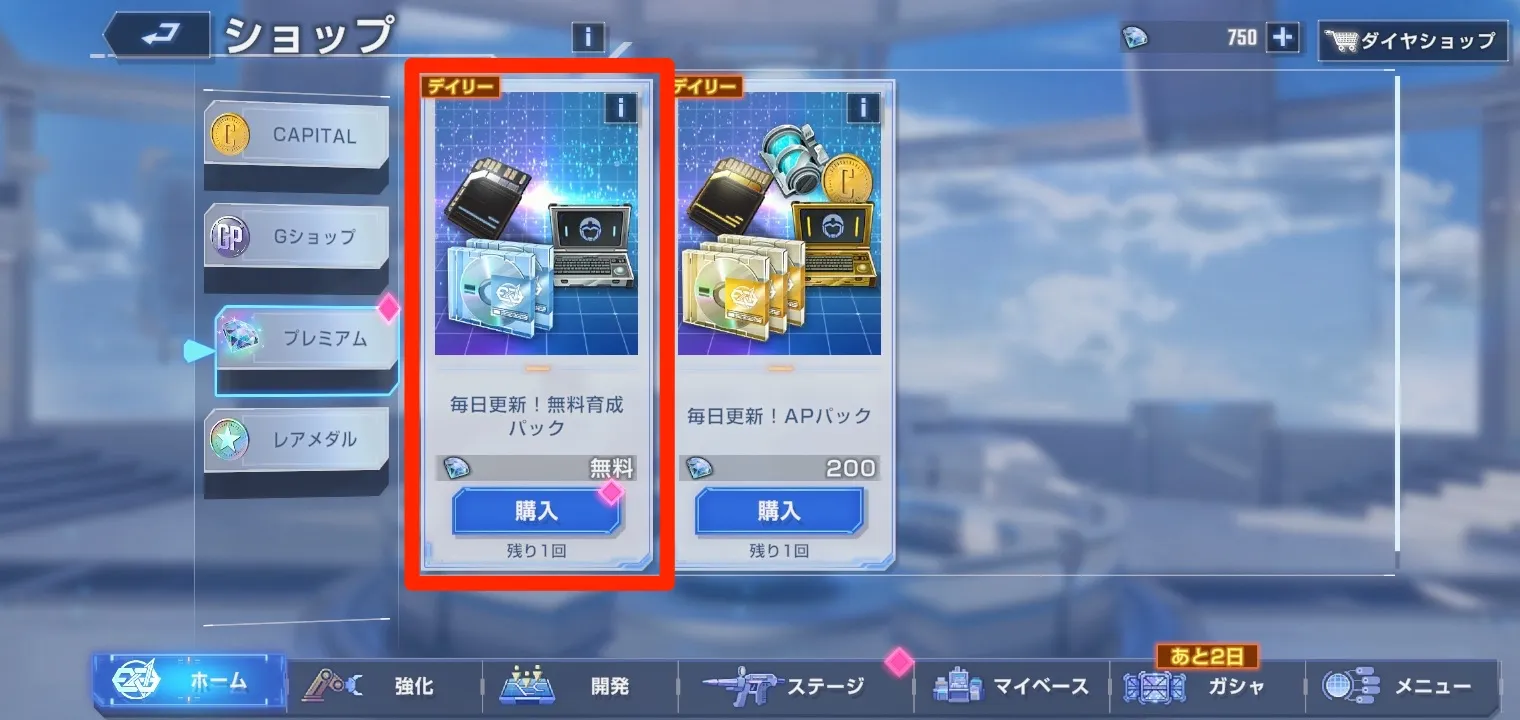 ショップでは1日1回限定で育成素材などを無料で入手できるパックが用意されているため、忘れずに貰っておこう。