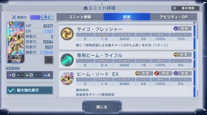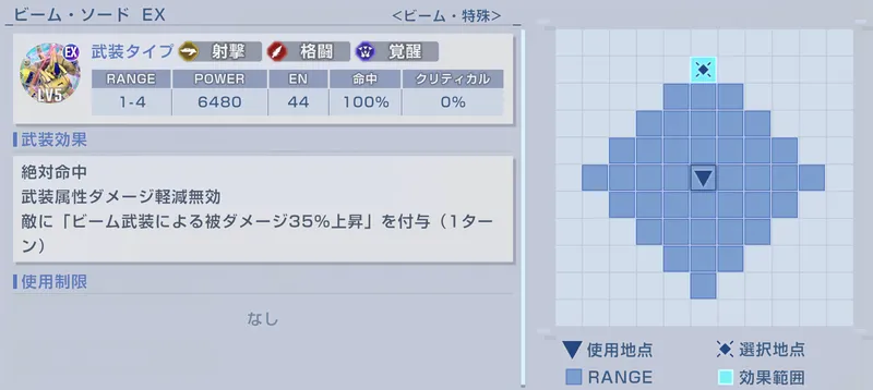 | 射程 | パワー | EN | 命中 | クリティカル |