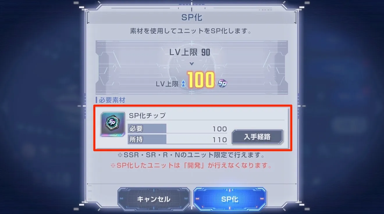 ユニットSP化とは、SSR以下のユニットに対して行える強化機能で、レアリティに関係なくレベル上限をLv100まで引き上げることが可能になる。上限解放により、ステータスが大きく上昇するため、SSR以下のユニットでも活躍が期待できるようになる強化手段だ。