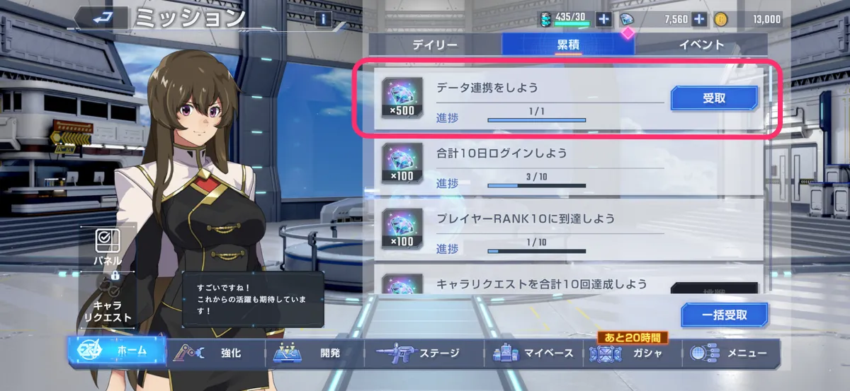 データ連携を行うと、累積ミッションの1つ「データを連携しよう」がクリアされ、ダイヤ500個を獲得できる。