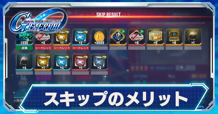 スキップ使用時は、クエストクリア時に得られる経験値を強化素材として受け取ることができる。受け取れる経験値は、最大数で編成した場合のものが基準となっており、メインステージでは「10機体・10キャラ・2サポーター」が獲得した経験値の合計分が強化素材として配布される仕組みとなっている。